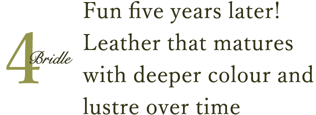 Bridle leather has beef tallow or beeswax applied not only to its surface but also worked deep inside of it, and as such possesses superb tensile strength and resistance to abrasion due to the oil and wax supplementing the strength of its fibre structure. Normal scratch marks can be removed almost entirely just by a rub with a fingertip. What's more, the same oil and wax brings about a water-repellent effect that makes bridle leather more resistant to rain than regular leather. While leather coated with fluororesin may come out on top when it comes to being tough against water, it comes with the demerit of sacrificing the natural texture of the leather. Bridle leather, on the other hand, allows us to enjoy a flavourful feel while retaining its wonderful appearance.